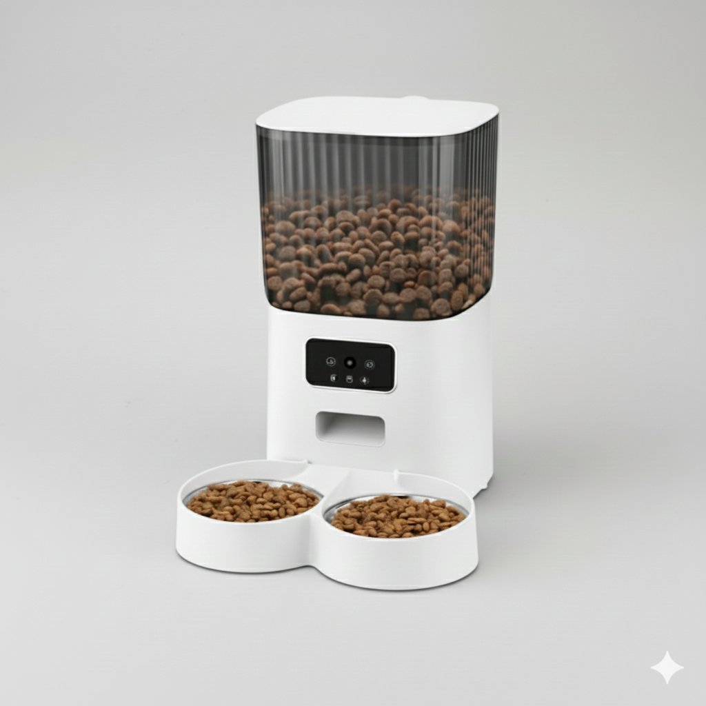 Este comedero permite programar y personalizar los horarios de alimentación desde una app. Incorpora cámara 1080P con video en tiempo real, detección de movimiento, audio bidireccional, mensajes de voz personalizados y batería de respaldo para hasta 15 días.